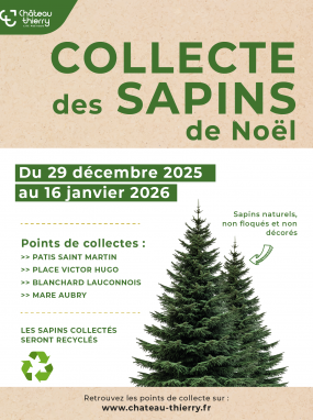 Alors que Noël vient de s'achever, vous avez la possibilité de donner une seconde vie à votre sapin. Jusqu'au 16 janvier 2026, 4 lieux de collecte sont à votre disposition à Château-Thierry. Votre sapin sera broyé et réutilisé pour protéger naturellement les espaces verts de la ville. Attention ! Seuls les sapins naturels (sans peinture ni flocage) seront acceptés.