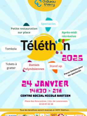 Le Téléthon 2026 se tiendra le 24 janvier 2026 de 14h30 à 21h au Centre social Nicole Bastien. Tout au long de l’après-midi et de la soirée, le public pourra assister à des spectacles variés, profiter de petites restaurations sur place, participer à la tombola et aux tickets à gratter, découvrir des danses polynésiennes, des numéros de stand-up et des animations récréatives.