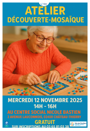 Le mercredi 12 novembre 2025, de 14h à 16h, le Centre social Nicole Bastien, situé au 2 avenue Lauconnois, propose un atelier découverte autour de la mosaïque. Ce moment convivial permettra aux participants de laisser libre cours à leur créativité et de s’initier à cette pratique artistique accessible à tous.
