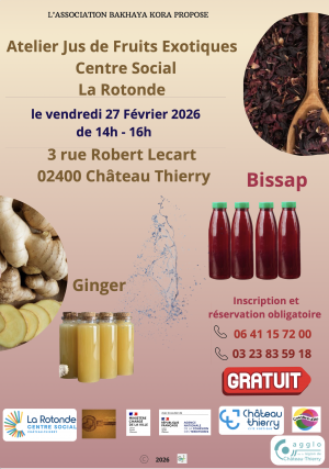 L’association Bakhaya Kora vous invite à participer vendredi 27 février 2026, de 14h à 16h à un atelier convivial dédié à la découverte et à la préparation de jus de fruits exotiques. Au programme : réalisation d’un jus de bissap et d’un jus de gingembre, dans une ambiance chaleureuse et gourmande.