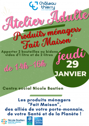 Le jeudi 29 janvier, de 14h à 16h, le Centre social Nicole Bastien propose un atelier adulte consacré à la fabrication de produits ménagers « fait maison ».