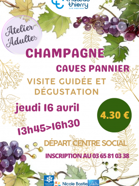 Le Centre social Nicole Bastien propose un atelier adultes avec une visite guidée et dégustation aux Caves Pannier, le jeudi 16 avril de 13h45 à 16h30.