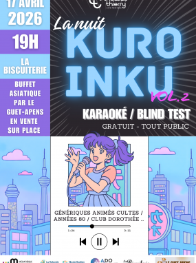 La Biscuiterie accueille La Nuit Kuro Inku le vendredi 17 avril 2026 à partir de 19h. Cette soirée dédiée à la pop-culture proposera un blind-test musical, suivi d’un karaoké ouvert à toutes et tous.
