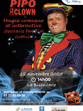Ne manquez pas une après-midi magique et pleine de rires avec Pipo le clown, le 12 novembre 2025 à 14h à la Biscuiterie. Ce spectacle interactif mêle humour et magie pour émerveiller petits et grands.