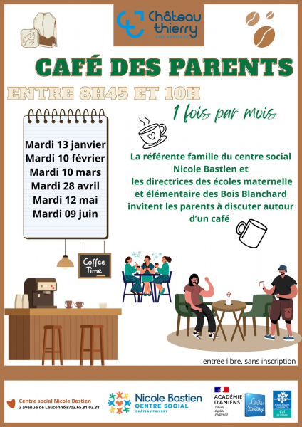 Les parents sont invités à participer au Café des parents, un rendez-vous mensuel organisé de janvier à juin, de 8h45 à 10h. La référente famille du Centre social Nicole Bastien et les directrices des écoles maternelle et élémentaire des Bois Blanchard proposent un moment d’échanges et de discussion autour d’un café. L’entrée est libre et aucune inscription n’est nécessaire.