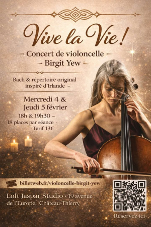 Le loft Jaspar Studio accueille un concert intimiste de violoncelle avec l’artiste Birgit Yew, autour d’un programme mêlant des œuvres de Bach et un répertoire original inspiré de l’Irlande. Deux soirées sont proposées les mercredi 4 et jeudi 5 février, avec deux séances par soir à 18h et 19h30, au loft Jaspar Studio, 19 avenue de l’Europe à Château-Thierry.