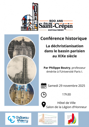 La Ville de Château-Thierry organise le samedi 29 novembre 2025 à 17h30, au Salon de la Légion d’Honneur, une conférence sur « La déchristianisation dans le bassin parisien au XIXᵉ siècle ».