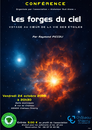 Cette conférence organisée par l'association "Alzheimer Sud Aisne" le vendredi 24 octobre 2025 – de 20h30 à 23h00 propose un véritable voyage au cœur de la vie des étoiles, depuis leur naissance dans les nébuleuses jusqu’à leur ultime transformation par Raymond Piccoli.