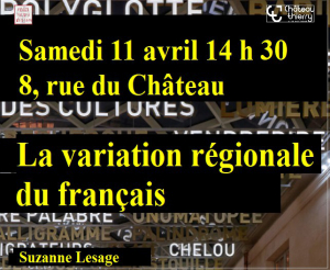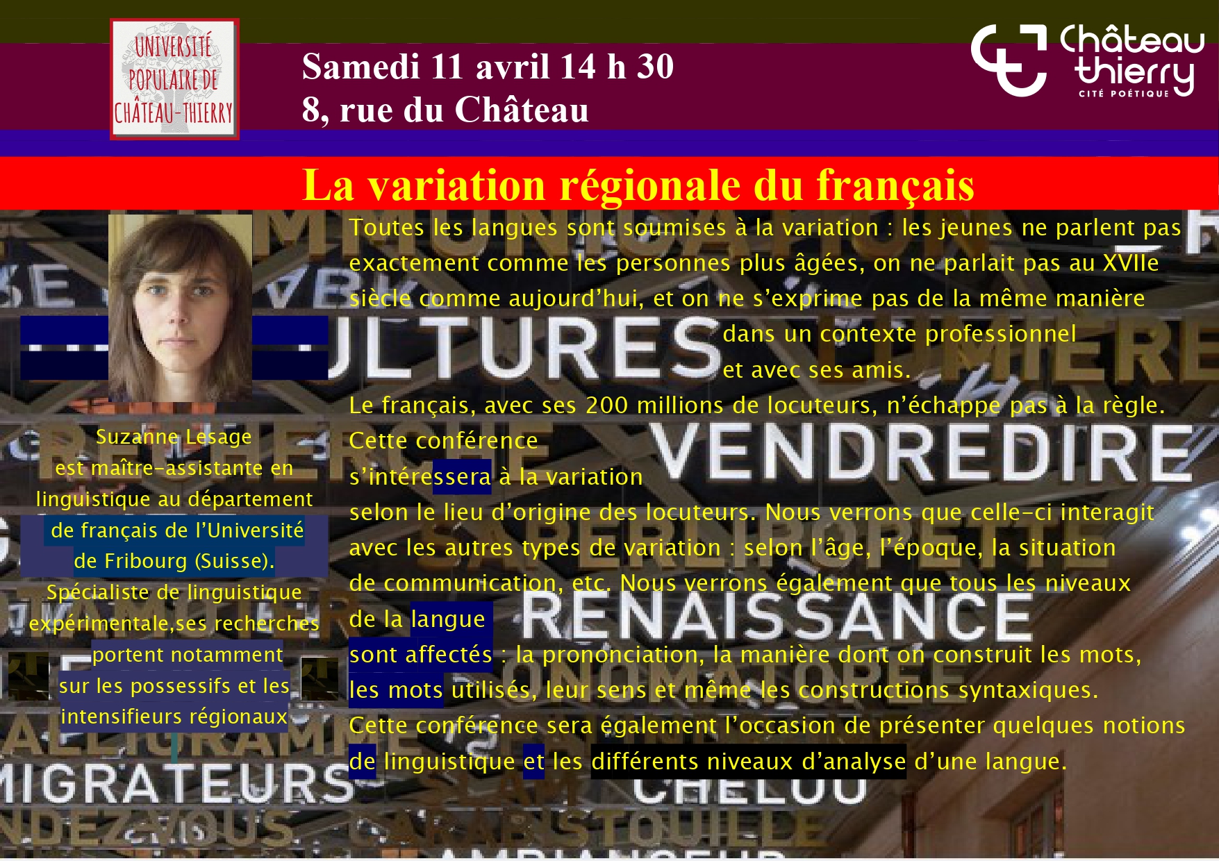 L'université populaire de Château-Thierry vous invite le samedi 11 avril 2026 à assister à une conférence sur la variation régionale du français au 8, rue du Château. Elle sera présentée par Suzanne Lesage, maître-assistante en linguistique au département de français de l'Université de Fribourg (Suisse).