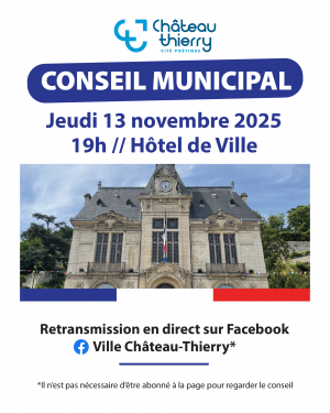 La Ville de Château-Thierry vous invite à suivre le prochain conseil municipal qui se déroulera le jeudi 13 novembre 2025, à partir de 19h, à l'Hôtel de Ville.
