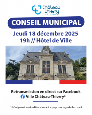 La Ville de Château-Thierry vous invite à suivre le prochain conseil municipal qui se déroulera le jeudi 18 décembre 2025, à partir de 19h, à l'Hôtel de Ville.
