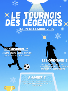 Le 29 décembre 2025, les centres sociaux Nicole-Bastien et La Rotonde organisent un tournoi de football destiné aux jeunes de 11 à 17 ans. Les équipes, composées de cinq joueurs, sont invitées à s’inscrire auprès des centres sociaux pour participer à cet événement sportif et convivial.