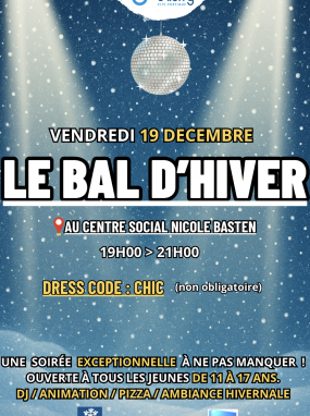 Le centre social Nicole-Bastien organise un bal festif le vendredi 19 décembre 2025, de 19h à 21h, pour tous les jeunes âgés de 11 à 17 ans. Cette soirée proposera une ambiance hivernale avec DJ, animations et restauration sur place. Un dress code chic est proposé, sans obligation.