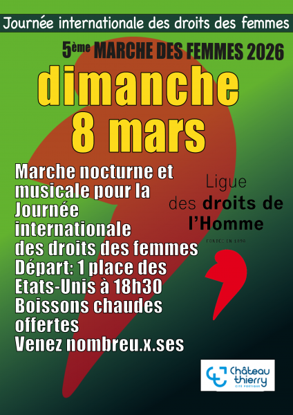 Dimanche 8 mars 2026, la Ligue Journée des droits de l’Homme organise la 5ᵉ Marche des Femmes à l’occasion de la Journée internationale des droits des femmes. La marche, nocturne et musicale, partira de la place des États-Unis à 18h30. Des boissons chaudes seront offertes aux participants. Venez nombreux pour célébrer ensemble les droits des femmes.