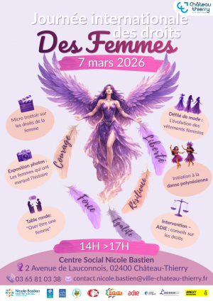 Le Centre Social Nicole Bastien vous invite à célébrer la Journée Internationale des Droits des Femmes le samedi 7 mars 2026, au 2 avenue de Lauconnois à Château-Thierry. Au programme de cette journée : la projection d’un court-métrage sur les droits des femmes, une exposition de photographies mettant en lumière les femmes qui ont marqué l’histoire, un défilé illustrant l’évolution des vêtements féminins, ainsi qu’une initiation à la danse polynésienne. L’ADIE interviendra également pour apporter conseils et informations sur les droits des femmes.