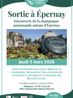 Le service Seniors de la Ville vous propose une sortie conviviale à Épernay, à la découverte de la Champagne gourmande, le jeudi 5 mars 2026.