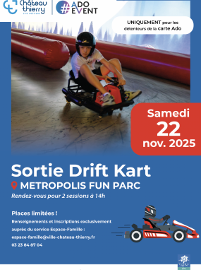 Le samedi 22 novembre 2025, les jeunes détenteurs de la carte Ado sont invités à participer à une sortie Drift Kart au Metropolis Fun Parc. Deux sessions sont proposées à partir de 14h.