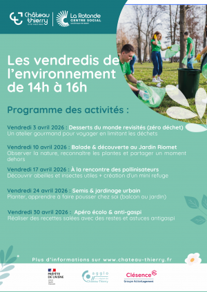 Le centre social La Rotonde vous invite à participer aux Vendredis de l’Environnement, chaque vendredi d’avril de 14h à 16h, pour découvrir des activités ludiques et écoresponsables.