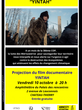 L'association Amnesty International de Château-Thierry vous invite à la projection de "Yintah" à l'amphithéâtre du Palais des Rencontres, un film documentaire canadien plusieurs fois primé. Ce film fort retrace une décennie de lutte de la nation Wet'suwet'en contre la construction d'un gazoduc qui détruit son territoire, à l'ouest du Canada.