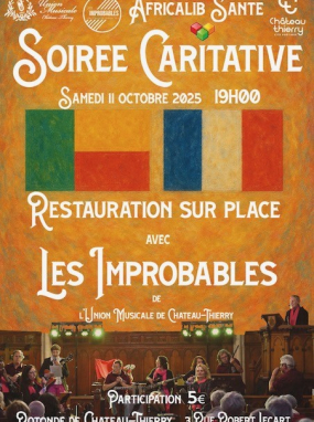 L'association AfricaLib Santé vous propose une soirée caritative au centre social La Rotonde, le samedi 11 octobre 2025, avec restauration sur place et concert des Improbables de l'Union Musicale. Participation 5 €
