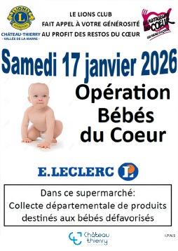 Le Lions Club Vallée de la Marne organise le samedi 17 janvier 2026 l’opération “Bébés du Cœur” au E.Leclerc de Château-Thierry.