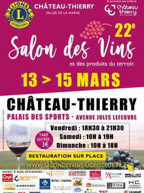 Le Lions Club, en partenariat avec la Ville de Château-Thierry, vous invite à participer au 22ème Salon des Vins et des produits du terroirs au Palais des Sports du 13 au 15 mars 2026.