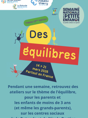 Dans le cadre de la Semaine nationale de la petite enfance du 14 au 21 mars 2026, les centres sociaux La Rotonde et Nicole Bastien vous invitent à une série d’ateliers sur le thème de l’équilibre.