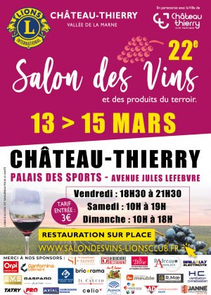 Le Lions Club, en partenariat avec la Ville de Château-Thierry, vous invite à participer au 22ème Salon des Vins et des produits du terroirs au Palais des Sports du 13 au 15 mars 2026.