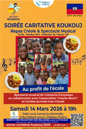 Participez à la Soirée Caritative Koukouj 2026, organisée au profit de l’association pour les enfants d’Haïti, le samedi 14 mars à 19h à la salle Louis Gomez du Centre social La Rotonde. Cette soirée placée sous le signe de la solidarité et du partage vous invite à savourer un délicieux repas créole composé d’un apéritif, de plats typiques et d’un dessert, dans une ambiance chaleureuse et conviviale. La soirée sera rythmée par un spectacle musical de chansons françaises, proposé en collaboration avec l’association Chante Morin et l’artiste-écrivain Ivan Claude.