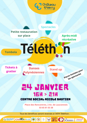 Le Téléthon 2026 se tiendra le 24 janvier 2026 de 16h à 21h au Centre social Nicole Bastien. Tout au long de l’après-midi et de la soirée, le public pourra assister à des spectacles variés, profiter de petites restaurations sur place, participer à la tombola et aux tickets à gratter, découvrir des danses polynésiennes, des numéros de stand-up et des animations récréatives. Les places pour les spectacles sont limitées.