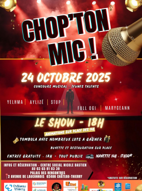 Le vendredi 24 octobre 2025, le Palais des Rencontres accueillera le concours musical « Chop Ton Mic – Le Grand Show ». Dès 16h, le public pourra profiter d’animations sur place, d’une buvette et d’un espace de restauration avant le début du spectacle à 18h.