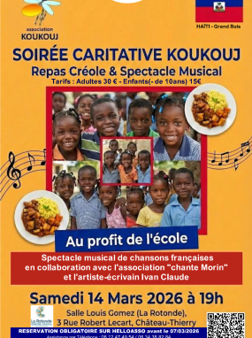 Participez à la Soirée Caritative Koukouj 2026, organisée au profit de l’association pour les enfants d’Haïti, le samedi 14 mars à 19h à la salle Louis Gomez du Centre social La Rotonde.