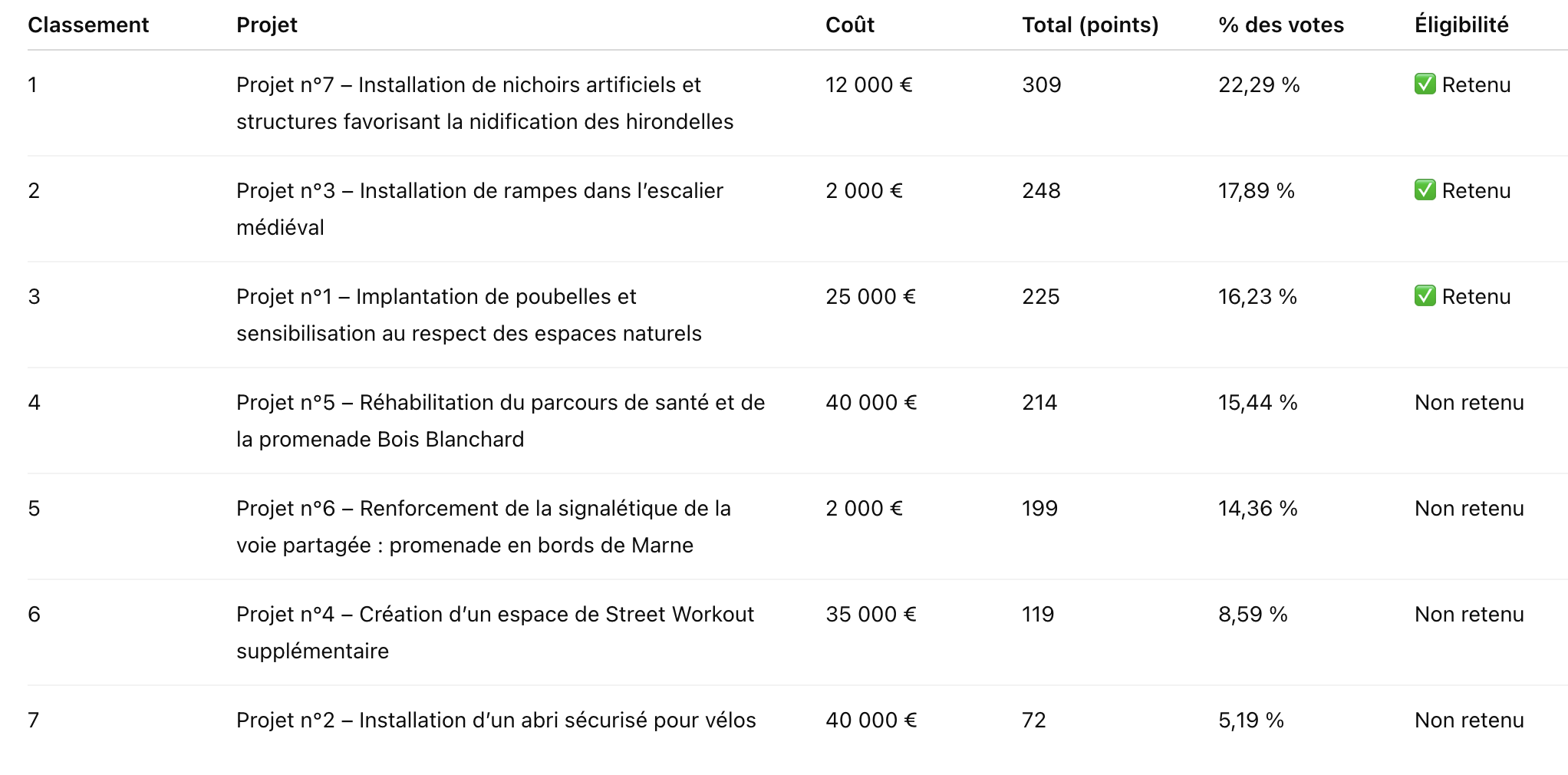• Installation de nichoirs artificiels et de structures favorisant la nidification des hirondelles (12 000 €) : Arrivé en tête avec 309 points (22,29 % des votes), ce projet contribuera à renforcer la biodiversité locale et à sensibiliser les habitants, en particulier les plus jeunes, à la protection des oiseaux.