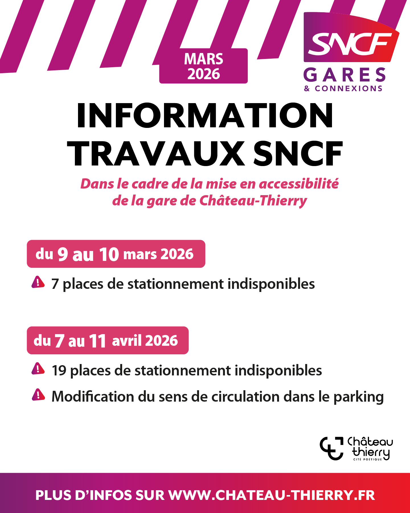 Dans le cadre des travaux d’accessibilité actuellement en cours à la gare de Château-Thierry (installation de trois ascenseurs), l’organisation des parkings évolue. Le parking Est rouvrira partiellement sur sa partie initiale. Le fond du parking restera toutefois occupé par la base vie du chantier. Par ailleurs, certaines places du parking Ouest seront temporairement indisponibles, durant deux périodes de deux semaines non consécutives.