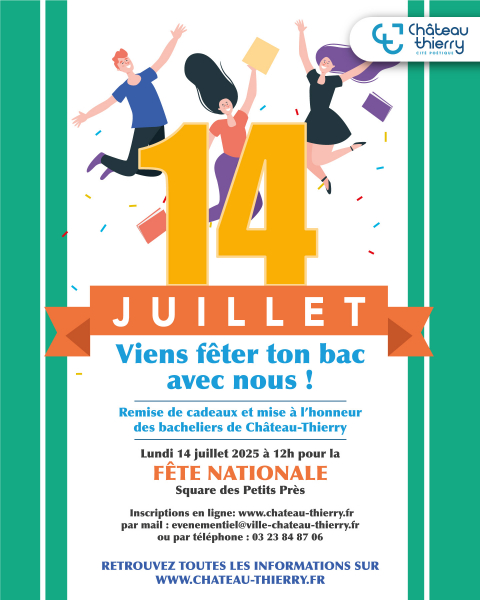 Comme tous les ans, la Ville de Château-Thierry félicite les jeunes castelthéodoriciens pour leur réussite au baccalauréat à l'occasion de la Fête nationale ! Vous êtes jeune bachelier ? Rendez-vous le lundi 14 juillet 2025 à 12h, Square des Petits Prés, pour une remise de récompenses à l'issue de la cérémonie officielle.